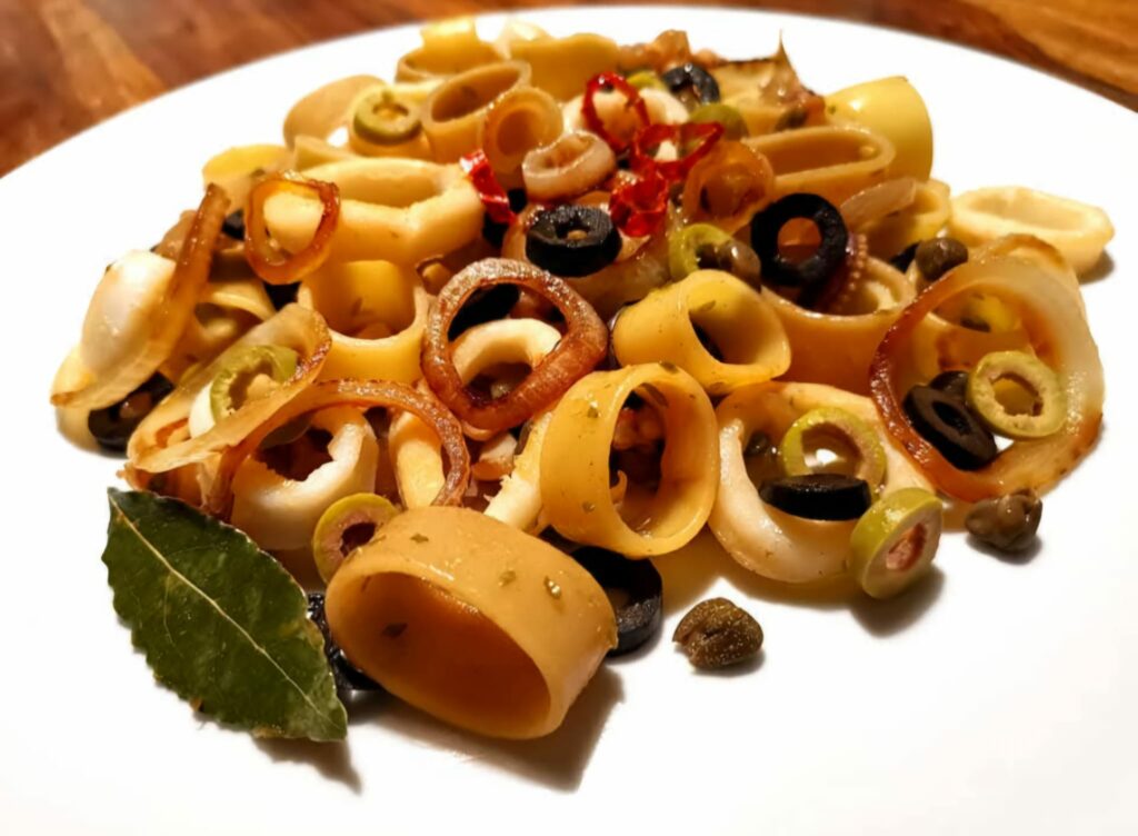 Cuocere, quindi, il calamaro insieme alla cipolla ben tritata e un paio di foglie di alloro, in modo da creare un leggero sughetto, e aggiungere anche gli altri ingredienti avendo cura di tenerne alcuni da parte per assemblare il piatto. Intanto, “sfriggere” la cipolla ad anelli, servirà successivamente. Lessare la pasta, unirla ai calamari con il loro sughetto e completare con gli ingredienti tenuti da parte in modo da mettere in evidenza le varie forme circolari. Volendo potete dare aroma con del basilico sminuzzato oppure dell’origano.