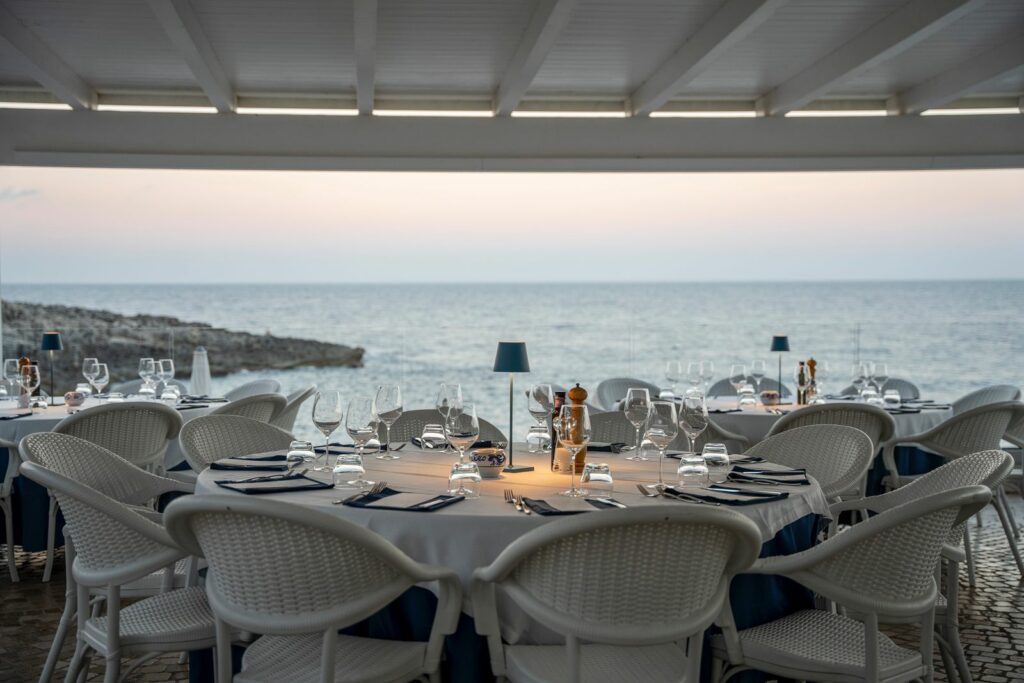 La strada segue la costa frastagliata, e si direbbe che voglia assecondarla con ogni curva, con ogni tornante che è costretta a formare, pur di non separarsi da uno degli scenari più suggestivi di Puglia. Una costa che in effetti può lasciare senza fiato l’ignaro visitatore giunto nel Salento per la prima volta, e che si estende per un lungo tratto a sud di Otranto, fino a raggiungere Santa Maria di Leuca. Tra chiazze di verde rigoglioso, e rocce aspre e selvagge che si tuffano nell’azzurro intenso del basso Adriatico. Poco prima di arrivare alla punta estrema, dove lo stesso Adriatico fonde le sue acque con con quelle dello Ionio, si può fare una sosta in un locale di Marina di Novaglie che sorge in una posizione davvero privilegiata.