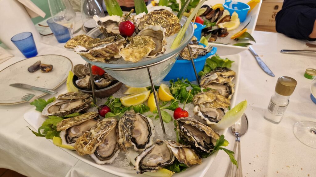 Io ho voluto provare la loro cucina, per cui un giorno sono andato a trovarlo e sono rimasto colpito dalla varietà e dalla qualità delle proposte di questo ristorante, repentinamente ma meritatamente balzato agli onori della cronaca. In particolare ho iniziato con un sontuoso piatto di frutti di mare crudi, completo di ricci, gamberi rossi e scampi locali, cozze pelose, cozze nere e tagliatelle di seppie crude, queste ultime servite simpaticamente in piccole vaschette azzurre che riproducono in miniatura i vasconi in plastica nei quali i baresi amano arricciare i molluschi cefalopodi. Poi, con un meraviglioso piatto di ostriche mi ha colpito al cuore, essendo io particolarmente appassionato del mondo variegato di questa prelibatezza, che comprendeva le Tarbouriech, le Gillardeau, la Regal Oro, la pugliese San Michele e la rara, minuscola, eccezionale Baby Kiss.