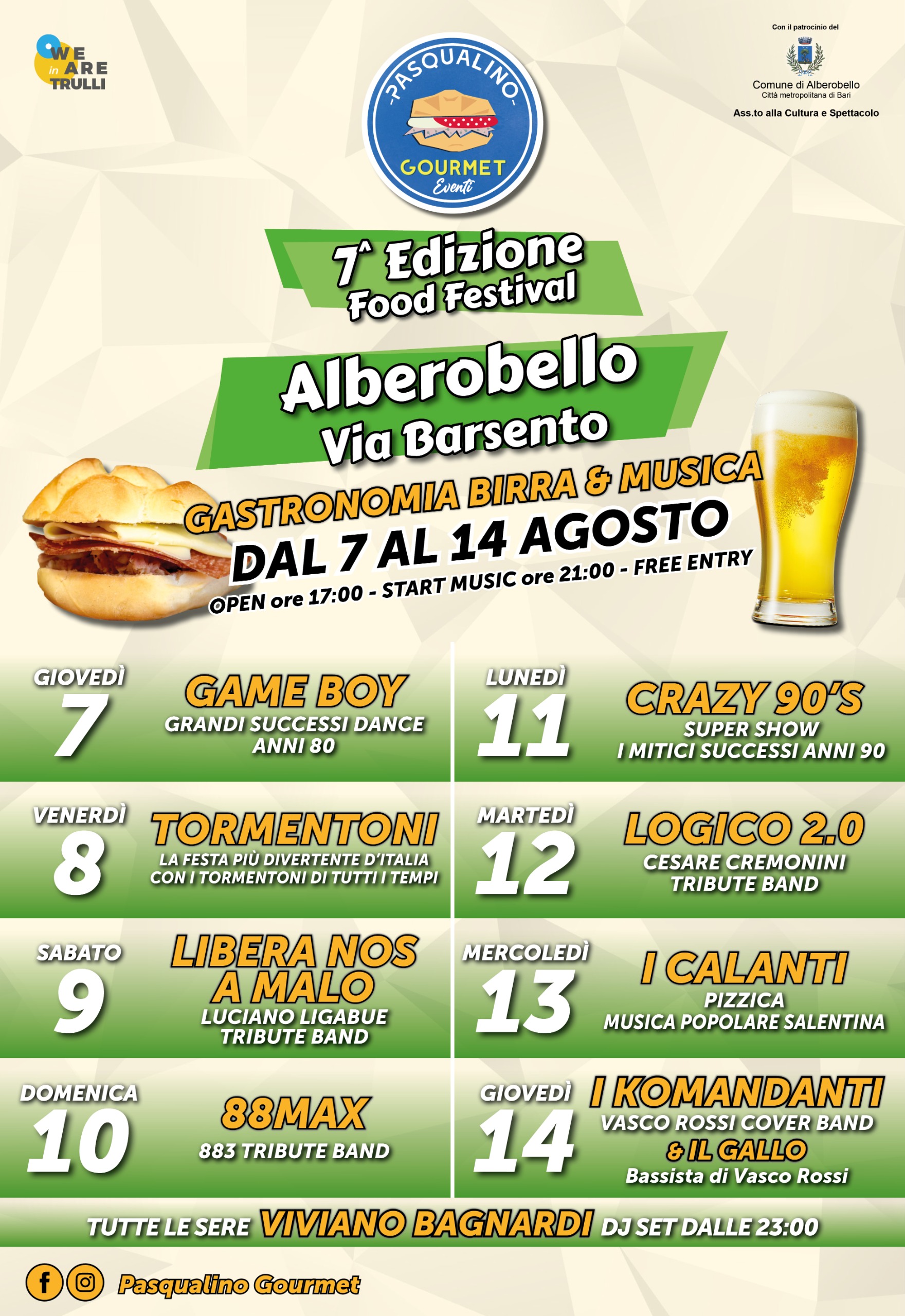L’evento sarà arricchito da una selezione di birre artigianali, da un’area dedicata ai bambini e da un ricco programma musicale: ogni sera, a partire dalle ore 21.00, spazio ai concerti dal vivo – dalla musica popolare al pop, dal rock ai grandi successi internazionali – seguiti da dj set che animeranno la festa fino a tarda notte. Novità della settima edizione è la partnership con la Fondazione Carnevale di Putignano, che curerà le installazioni in cartapesta presenti nell’area dell’evento.