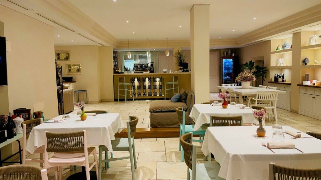Qui si avvale della collaborazione di Irene in sala, e di Emanuele Gorgoni ai dolci, e tutti insieme si occupano del pranzo e della cena; nonché, a beneficio esclusivo degli ospiti residenti, delle prime colazioni al mattino e degli aperitivi al tramonto. Si prende quindi posto nel luminoso e lineare ambiente interno, in alternativa al ridente dehors tra gli alberi, pronti ad assaggiare le creazioni di Luca, che danno l’idea di voler partire in sordina, per acquistare progressivamente vigore, incisività e carattere, senza mai smarrire il senso dell’equilibrio, e con il provvidenziale utilizzo di pochi ingredienti, che contribuisce a rendere riconoscibili i sapori. Dopo una fragrante focaccia da intingere in un olio della zona, si procede con la freschezza mediterranea della pescatrice al vapore con polvere di alghe, lattuga di mare e salsa allo yogurt . Oppure con il crudo di tonno rosso, porro e gelato di carosello (un po’ troppo freddo); e con la carota bruciata, arricchita da una fantastica maionese al sesamo e dalla salsa di aglio nero. Il momento più significativo della degustazione si raggiunge tuttavia con due primi, nei quali l’intensità del gusto si coniuga perfettamente con la magistrale leggerezza dell’esecuzione. Ovvero gli spaghettini (la cottura al dente è sorprendente, malgrado il tipo di formato di pasta) al burro affumicato, limone e bottarga di tonno, e le orecchiette mantecate alle cozze con conserva di pomodoro e cacio. Chapeau! La piccola pasticceria e i dolci tipici alle mandorle concludono la notevole esperienza gastronomica.