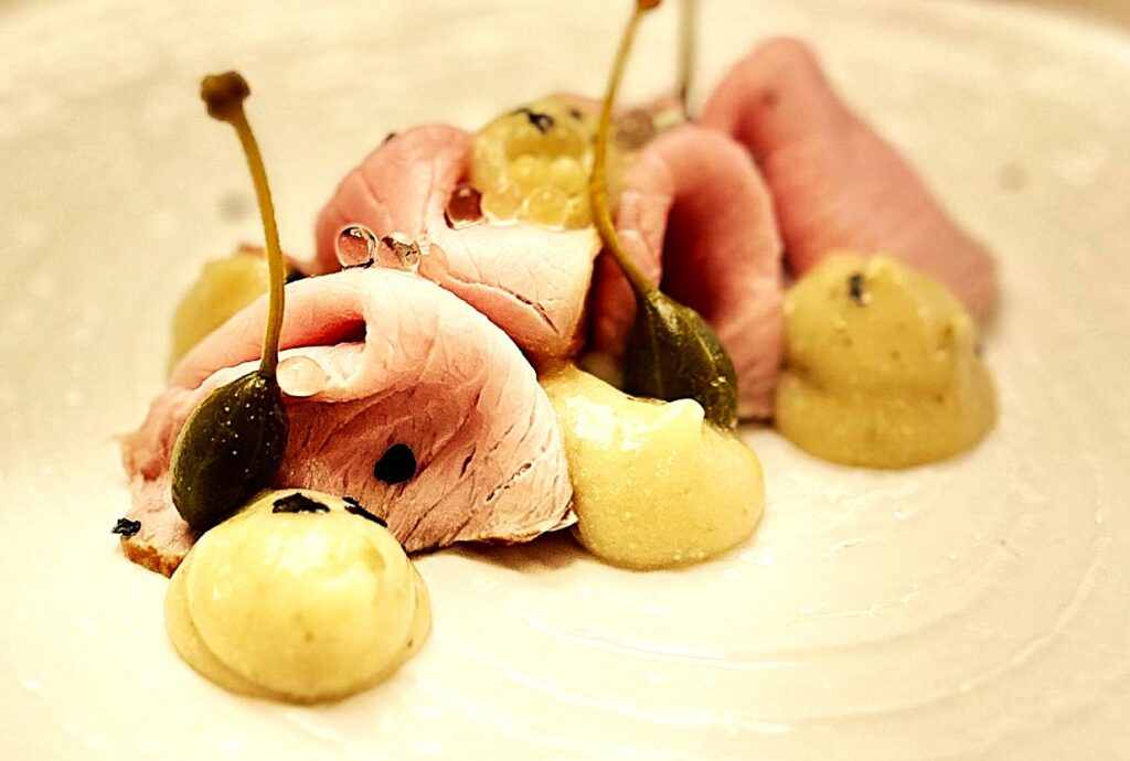 Se in questo locale la scelta di linea è legittimamente orientata in direzione dello street food d’asporto, e si attesta all’interno della categoria delle bracerie (o churrascherie), negli ambienti di Carnivora regna una differente tipologia di atmosfera. Qui il garbo e la cura dei dettagli, proiettati fino a raggiungere il terrazzo che ospita il dehors, vengono arricchiti dalla magnifica cantina sottostante, dotata di numerose importanti etichette nazionali e internazionali. Mentre nei piatti la concretezza e la veracità dei sapori si coniugano perfettamente con l’eleganza delle preparazioni e delle presentazioni. Si può quindi iniziare con la fresca e delicata tartare di fassona con burrata, pomodori gialli e pistacchi in due consistenze (crema e granella); oppure con il ghiotto hamburger di wagyu su pane biscottato al burro salato, con cicorie e maionese all’arancia. Per poi procedere con i morbidi e voluttuosi sentori dei tortelli al parmigiano con fassona tritata e caviale di tartufo nero. Imperdibili, tra i secondi, due piccoli capolavori resi tali dal sapiente dosaggio delle note acide, e dalla straordinaria leggerezza delle esecuzioni. Si tratta del vitello tonnato con sale nero, perle di yuzu e fior di cappero; e del filetto di fassona con salsa al porto e crema di cipolle.