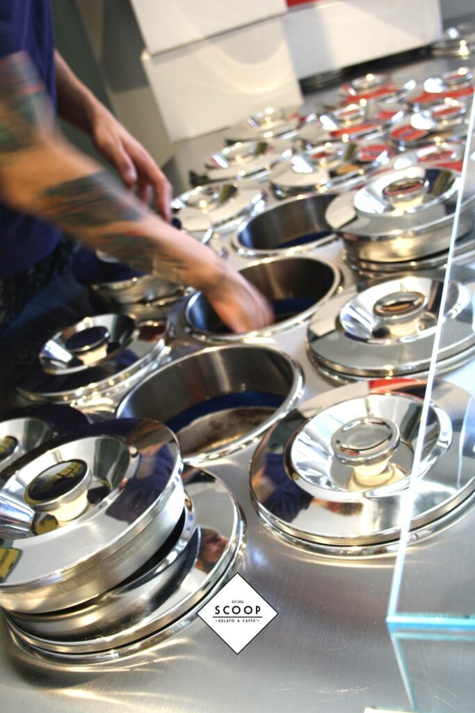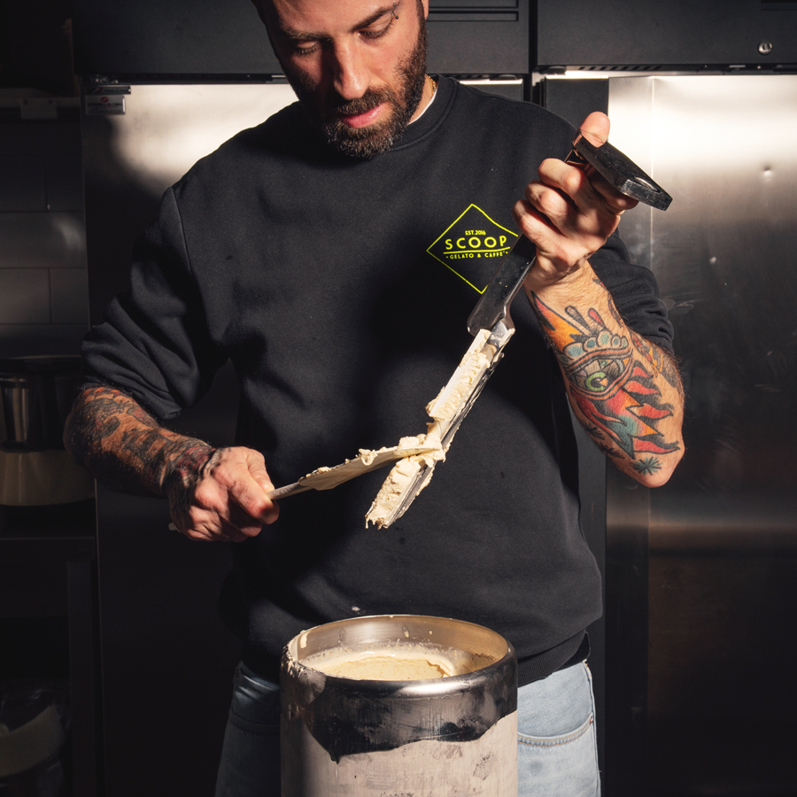 Per comprendere la filosofia alla base del gelato di Scoop si parte osservando il banco. Niente vetrina, solo pozzetti: un’eredità dell’esperienza con Marchetti. «La perdita del colpo d’occhio è compensata dal risparmio energetico e da una migliore shelf life del gelato. In più, i pozzetti offrono quell’allure retrò che oggi ci piace tanto».