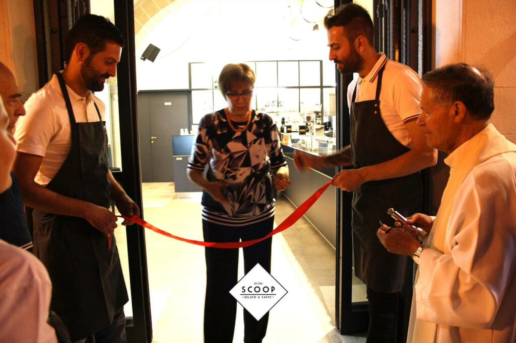 Nel 2013, pentito di non aver potuto iscriversi all’istituto alberghiero contrastando la volontà paterna, che lo voleva geometra e “libero” dal bar, Francesco si iscrive all’Università dei Sapori di Perugia. Qui frequenta la scuola italiana di gelateria, dove acquisisce le basi dell’arte fredda secondo Lucas Caviezel e Carlo Pozzi. Dopo quel percorso, inizia a lavorare con Alberto Marchetti per circa un anno. Qui apprende l’arte della composizione del cono e tutto ciò che c’è da sapere sul gelato contemporaneo. Ma il cuore di chi nasce in Puglia resta in Puglia per sempre. Unico desiderio pilota delle scelte della vita: tornare, sempre. Così, alla fine dell’estate del 2015, Francesco fa il suo ritorno a Canosa e a gennaio 2016 rileva il bar di famiglia. Con Marco, che porta con sé una solida esperienza nella catena di hotel Accord, inizia i lavori di ristrutturazione, concependo la seconda parte dell’insegna, quella che recita “gelato e caffè”. Il nome Scoop invece racconta della sorella di Francesco, Marianna, trasferitasi da tempo in Australia. Mentre si cerca un nuovo nome per questo storico bar, salta fuori questo schioppo linguistico, Scoop, che in inglese significa proprio “pallina di gelato”.