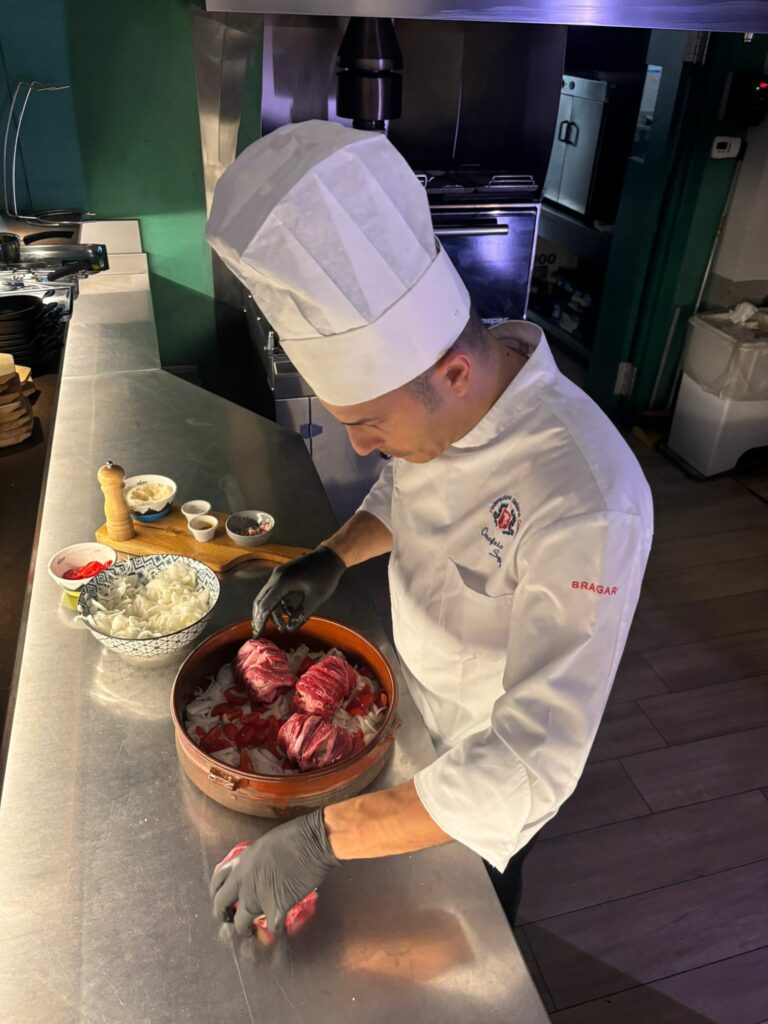 “Per prima cosa elenchiamo gli ingredienti – precisa Stefano De Carolis – che sono una fetta di carne bovina di 250/300 grammi, ventresca fresca di maiale, provolone dolce o semipiccante, formaggio canestrato pugliese grattugiato, peperoncino, sale, pepe, cipolla, pomodori e prezzemolo.