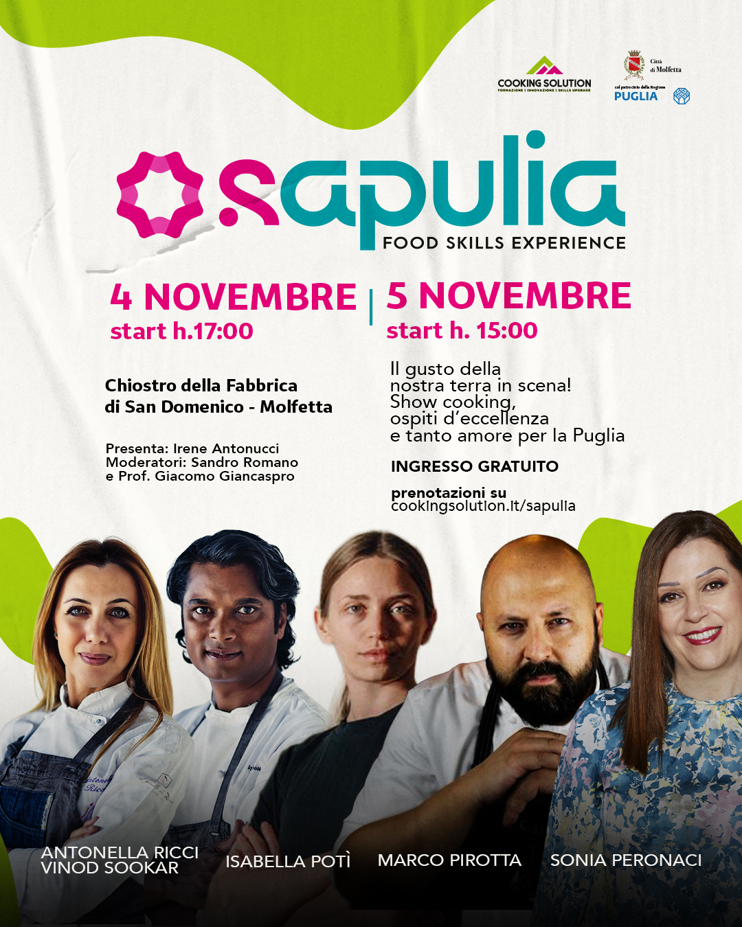 La storica Fabbrica di San Domenico a Molfetta è pronta a trasformarsi per due giorni in un laboratorio vivo di gusto, formazione e celebrazione dei prodotti locali di Molfetta e del territorio. Sono aperte le prenotazioni gratuite sul sito www.cookingsolution.it/sapulia per “Sapulia”, l’evento organizzato da Cooking Solution, con il patrocinio della Regione Puglia e del Comune di Molfetta, che martedì 4 e mercoledì 5 novembre porterà a Molfetta l’eccellenza della cucina, per diffondere competenze e carpire i segreti di chef e importanti professionisti del settore.