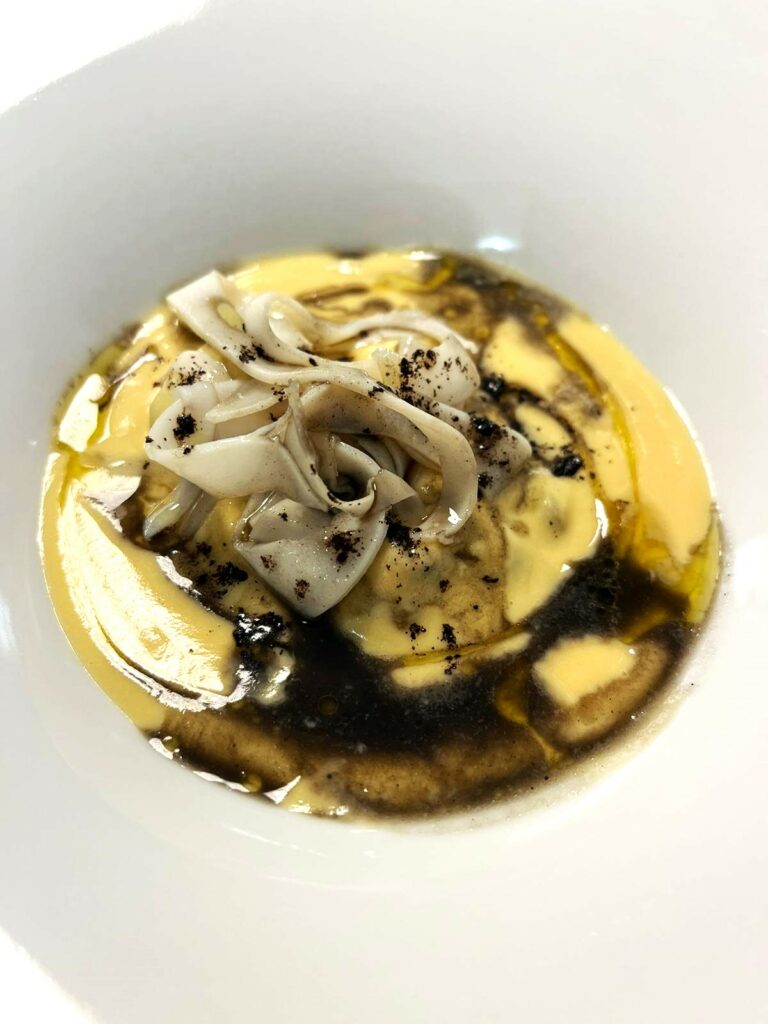 Lo possono facilmente scoprire coloro che prendono posto nella gradevole sala da pranzo (in origine un’abitazione privata) con accogliente camino centrale, ampio spazio nel verde per allestire fascinose cene estive, e la chicca dell’oliveto sul retro. Non a caso, una volta a tavola, viene servito un eccellente pane ai sette cereali fatto in casa, da intingere in un eccezionale olio di propria produzione: una ghiotta tentazione alla quale è impossibile resistere. Prima di procedere con le preparazioni di Giuseppe, organizzate nel rispetto di un preciso ordine tematico. A partire dall’esplosione di sapori e dal sorprendente equilibrio della zuppa autunnale: jus di anatra e di alghe marine con funghi e raperosse; oppure dal piccolo capolavoro della tagiatella di seppia con ceci alla cenere e jus di fegato di faraona e canocchie. In alternativa si può optare per le linguine con sinfonia di triglia di scoglio; e, tra i secondi, per il vitello porchettato (con lardo di Colonnata) con tartare di scampi, purea di zucca, chips di topinambur e jus di vitello di mare (anche chiamato smeriglio). Si chiude con la deliziosa fantasia di limone con polvere di olive nere, e con il desiderio di tornare presto a trovare Giuseppe.