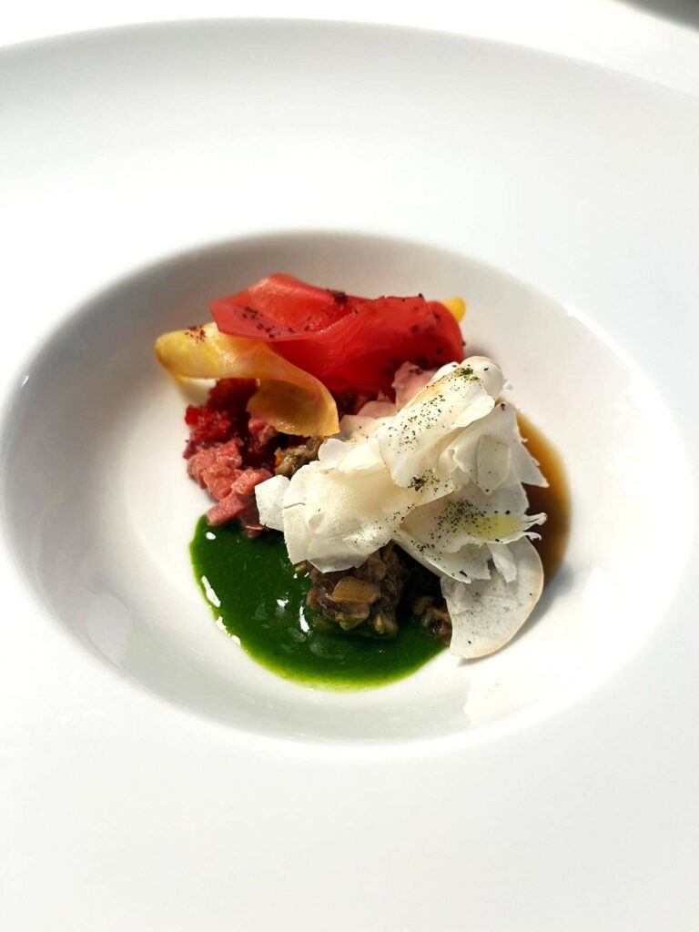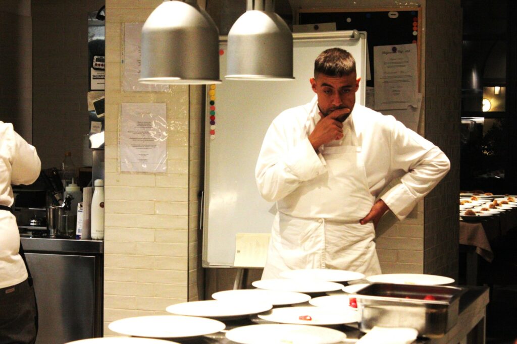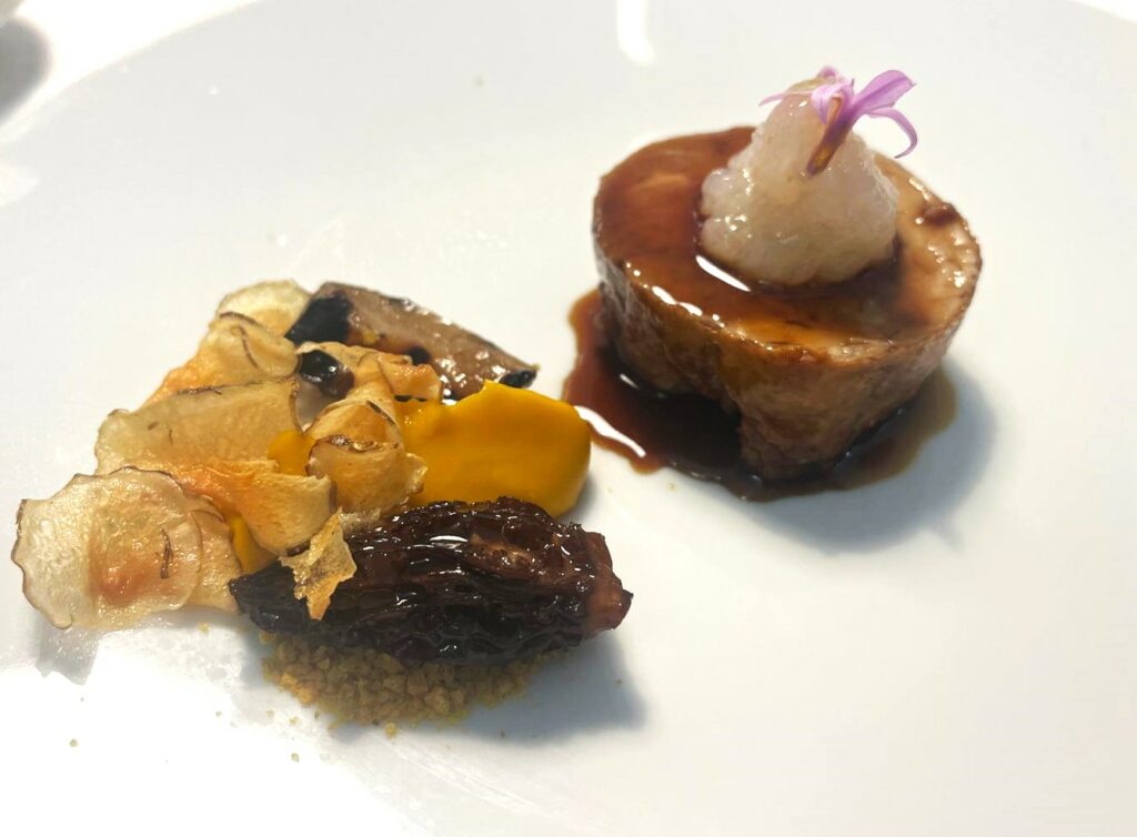 Il suo infatti è stato un percorso alquanto singolare, e in parte seguito da autodidatta. Tra gli studi presso la facoltà universitaria di giurisprudenza, dopo il liceo scientifico, e quelli della scuola dell’Alma; passando attraverso le esperienze giovanili, una lunga gavetta come commis (aiutante di cucina) in diverse strutture stellate, e gli insegnamenti di grandi maestri. Per poi tornare alle radici territoriali appunto, e diventare chef executive dello stesso ristorante Carèm, dove ha mosso i suoi primi passi nel settore in veste di appassionato stagista esordiente. E qui oggi opera ai fornelli come se componesse una sinfonia o dipingesse un quadro. Nel senso che cura scrupolosamente l’effetto cromatico delle presentazioni, e che tende a realizzare un risultato finale decisamente armonioso, anche quando si misura con abbinamenti piuttosto arditi tra gli ingredienti. Anzi, si potrebbe dire che l’accostamento dei prodotti del mare e della terra sia una sorta di costante creativa nei suoi piatti, insieme al ricorrente utilizzo del jus, ovvero un condimento di base largamente presente nei manicaretti d’Oltralpe.