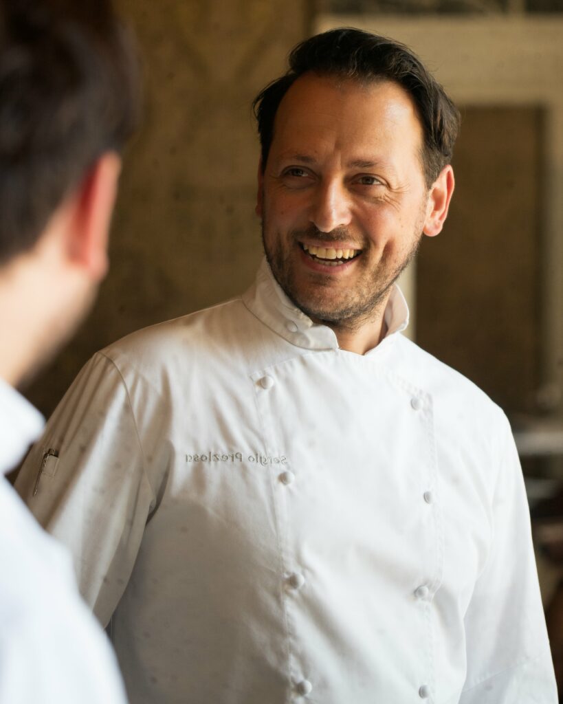Da vent’anni nel gruppo Alajmo, Sergio Preziosa è chef del ristorante Quadri, scrigno d’epoca ripensato da Philippe Starck, affacciato sulla meraviglia di Piazza San Marco. Nato a Molfetta nel 1984 e cresciuto a Bisceglie, è vissuto in Puglia fino al diploma presso l’alberghiero locale. “All’epoca era molto rinomato e vantava bravissimi professori, che mi hanno fatto innamorare”, racconta. “Ma la passione arriva da mio zio, che aveva una salumeria. Fin da piccolo lo aiutavo e assaporavo prodotti eccezionali. Mio papà poi è un bravissimo cuoco casalingo, ricordo che andava al mare e ci preparava i polpi e le pelose. Lui cucinava, io guardavo e inzuppavo il pane nel sugo. Dopo la scuola ho iniziato a fare il lavapiatti in un ristorante di Bisceglie, poi mi sono dato da fare in pizzerie e ristorantini. Ho trascorso un paio d’anni in Alta Badia e poi sono arrivato a Venezia all’Hotel Monaco; ho fatto il primo fine dining alla Taverna di Coloredo e inviando curriculum a tutti gli stellati italiani, mi ha risposto solo Alajmo. A luglio 2005 ho iniziato al Calandrino e dopo 5 mesi sono passato ai primi e ai secondi delle Calandre, dove mi sono fermato due anni e mezzo. Poi volevo fare un po’ di Francia e ho trascorso un anno alla Maison Pic, sono stato secondo di cucina a Vigo di Fassa e ho aperto il mio ristorante a San Secondo Parmense, Relais Galù. Dopo 3 anni è successo che mi ha chiamato Massimiliano per andare a Parigi, sono rientrato alle Calandre, ho aperto Caffè Stern e da quasi dieci anni sono chef del Quadri con Silvio Giavedoni, executive di origini friulane”.