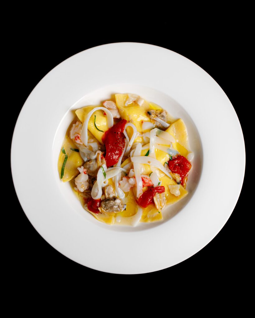 Ravioli di burrata con guazzetto di laguna e filetti di pomodoro all’origano