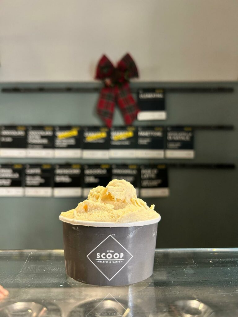 Francesco Di Nunno non ha panettoni in vendita nel suo bar, ma da sempre Scoop Caffè e Gelato sa sempre come farsi notare. Nel banco, infatti, per tutte le feste natalizie sarà disponibile il gelato al panettone, realizzato a partire dal grande lievitato firmato da Marco Lattanzi del Panificio Il Toscano. Il resto della magia la fanno materie prime di Scoop.