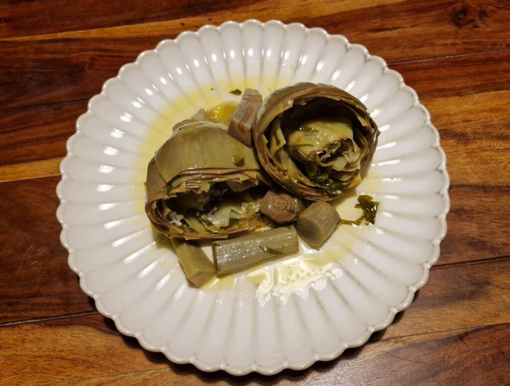 Il carciofo ci accompagna dai primi freddi fino ai primi sentori di bella stagione e non ci sono dubbi che sia tra le verdure più richieste in questo arco di tempo. È golosissimo cucinato i tanti modi, in particolare fritto, ma il suo gusto così unico si presta a tante ricette delle cucine regionali italiane. Tra le tante ricette voglio spiegarne una in particolare che, pur non essendo tipicamente pugliese, è tra le più utilizzate nelle nostre cucine: i carciofi alla romana. Si tratta di una ricetta che, se ben fatta, dà tanta soddisfazione perché è gustosissima ma anche molto leggera. A patto, però, che non venga utilizzato troppo pane per la scarpetta nel suo fantastico intingolo, cosa davvero molto difficile, in quanto quell’acquetta saporitissima lo chiama e non si può resistere.