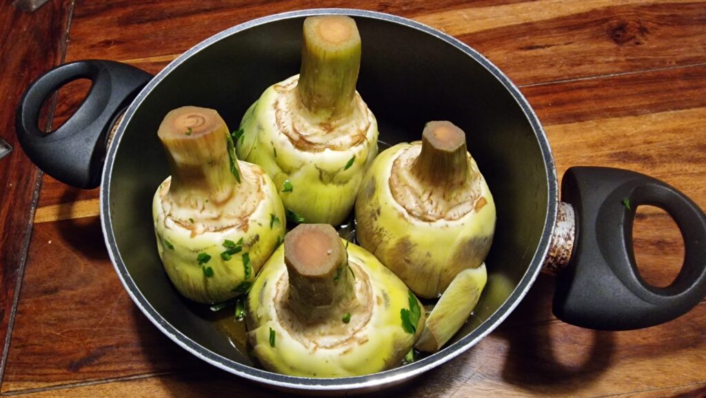 Inseriti tutti gli odori all’interno dei carciofi, scegliete una pentola che possa contenerli mantenendoli piuttosto stretti e, prima di accomodarli, mettete un bel giro abbondante di ottimo olio extravergine. Qualcuno mette anche delle acciughe sotto sale, sapore che io gradisco particolarmente perché caratterizza ancor più la ricetta. Negli spazi restanti, invece, si possono mettere i gambi ben nettati. A questo punto aggiungete un dito d’acqua, sale e pepe di mulinello, e coprite i carciofi con carta da forno, in modo da creare una specie di camera che conterrà calore e vapori.