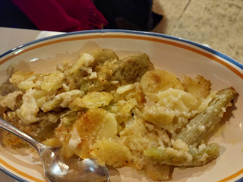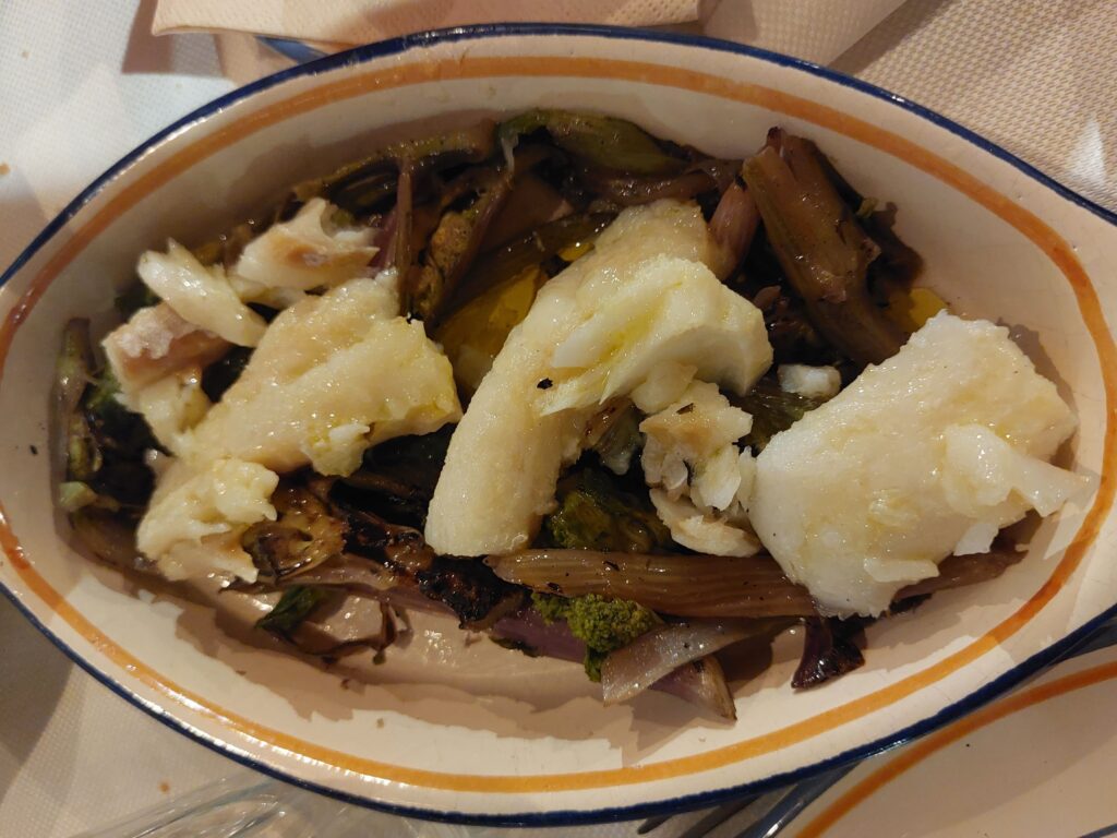 Nella serata dei Camini lo smirnio c’è sempre, di solito nel modo più semplice e godurioso: fritto in pastella, ma questa volta “la signora dello Smirnio e delle erbe” (Rosanna) ha osato fare una teglia con il baccalà. Sorvolo sulla bontà del baccalà, tenero e succulento. Lo smirnio legava in maniera assolutamente perfetta restituendo sentori di fresco e amarognolo, una convoluzione tra la sapidità del baccalà e le ondate balsamiche dell’olio giovane capace di avvolgere l’amigdala e restituire un piacere ben oltre le soglie gustolfattive. Il crunch della bruschetta completava le percezioni sensoriali lasciandoci appesi in uno spazio infinito dal quale si rientrava con un calice di rosato ben fresco.