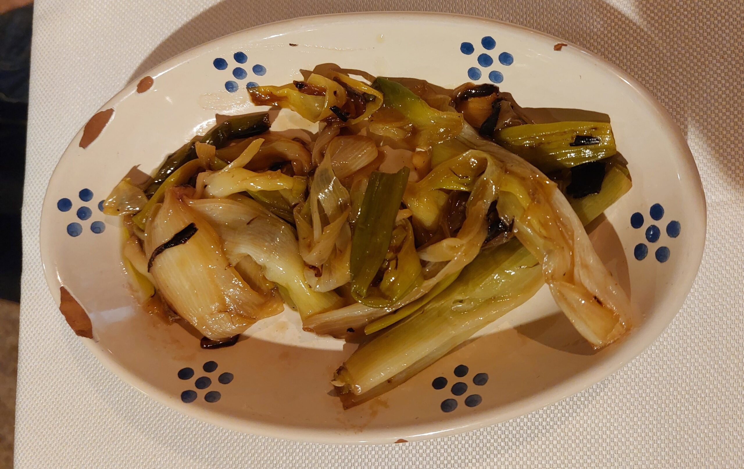 Nella serata dei Camini lo smirnio c’è sempre, di solito nel modo più semplice e godurioso: fritto in pastella, ma questa volta “la signora dello Smirnio e delle erbe” (Rosanna) ha osato fare una teglia con il baccalà. Sorvolo sulla bontà del baccalà, tenero e succulento. Lo smirnio legava in maniera assolutamente perfetta restituendo sentori di fresco e amarognolo, una convoluzione tra la sapidità del baccalà e le ondate balsamiche dell’olio giovane capace di avvolgere l’amigdala e restituire un piacere ben oltre le soglie gustolfattive. Il crunch della bruschetta completava le percezioni sensoriali lasciandoci appesi in uno spazio infinito dal quale si rientrava con un calice di rosato ben fresco.