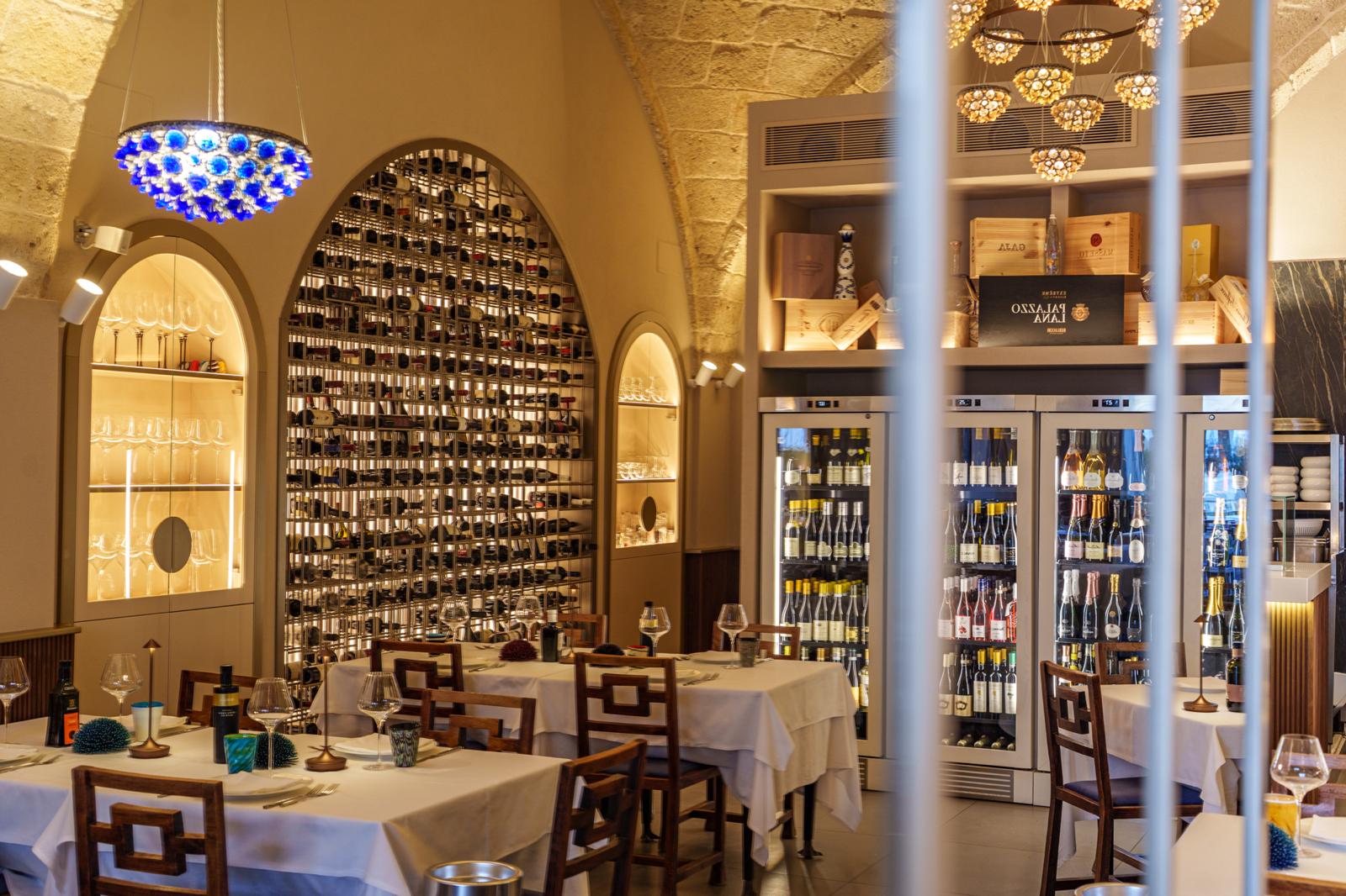 Si entra dunque nella luminosa sala da pranzo, sempre molto frequentata anche all’ora di pranzo di un qualsiasi giorno feriale, e si viene subito colpiti dalle tante bottiglie a vista, e dall’invitante bancone del pesce. Evidenti allusioni ai piaceri della convivialità, che trovano immediato riscontro nel meraviglioso paté di olive che viene servito sul pane caldo, e nel freschissimo e sontuoso crudo di mare. Non a caso qui la ricerca dei prodotti di qualità procede in tutte le direzioni, tanto verso il porto quanto verso l’orto, e gli ortaggi impiegati nelle diverse preparazioni sono di straordinaria bontà. A partire dalle bietole che accompagnano il tonno scottato con tarallo sbriciolato e crema di datterino giallo, il cui sentore agrumato regala slancio al risultato complessivo; per poi continuare con i tentacoli di polpo su crema di patate, cime di rape, chips di polenta e pomodori essiccati di Torre Guaceto. Mentre il sugo preparato con gli stessi pomodori svolge un ruolo da protagonista, o da coprotagonista, in un piatto che da solo vale un viaggio. Si tratta dei cremosi spaghetti ai gamberi, impreziositi della piacevole nota di freschezza dei germogli di piselli, e seguiti da un delicatissimo scorfano gratinato al forno. Il sorbetto finale chiude un’esperienza davvero doddisfacente, da tutti i punti di vista.
