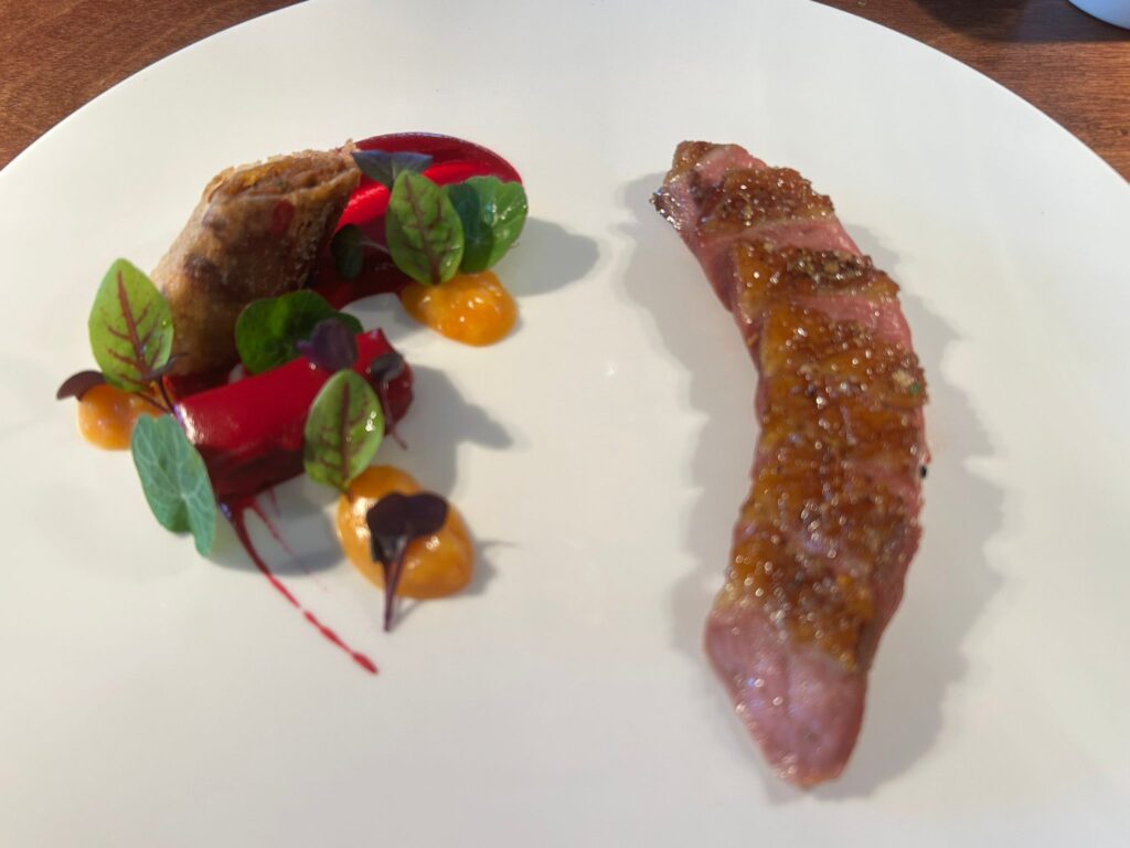 Anatra glassata al miele con barbabietola arancia involtino di cosce-d’anatra e fondo di cottura aromatizzato con la melagrana