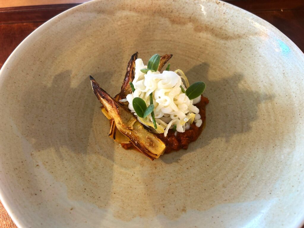 Calamaro con ragu di polpo carciofi grigliati e limone salato