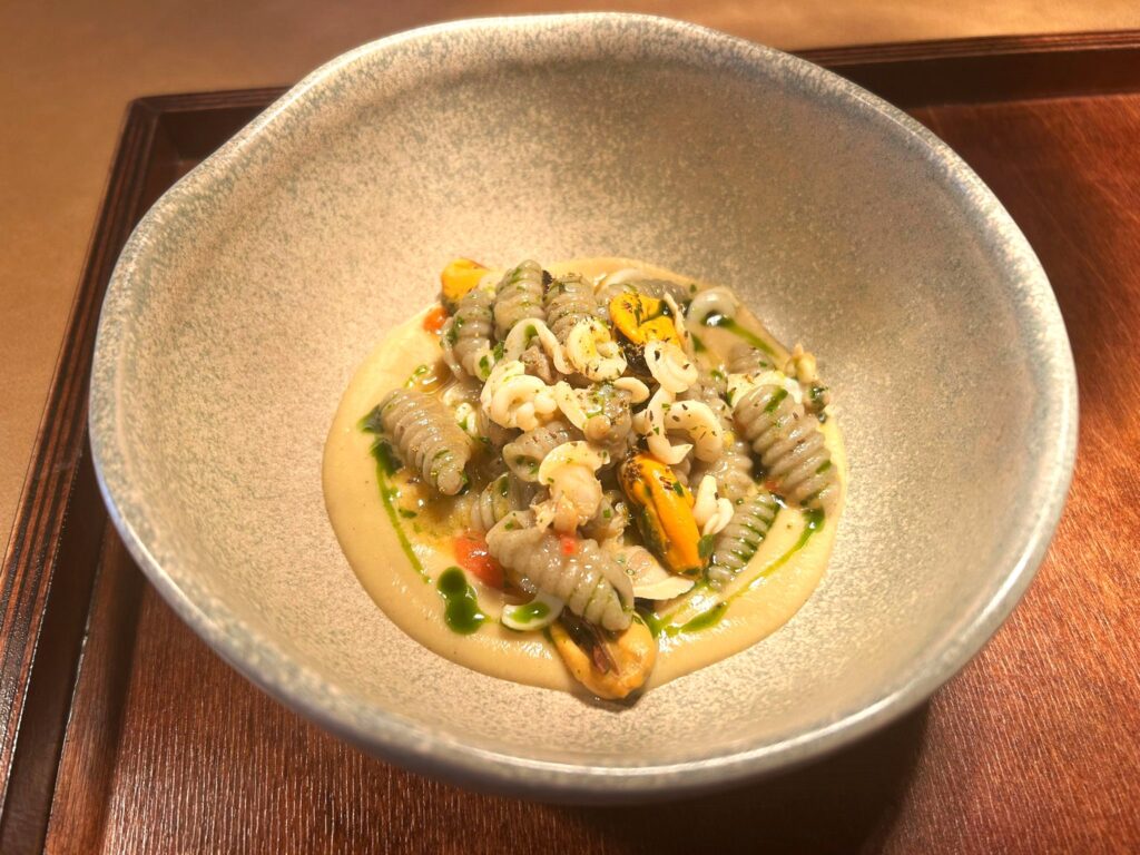 Cavatelli di grano arso ai frutti di mare con crema di cicerchia aglio olio e peperoncino