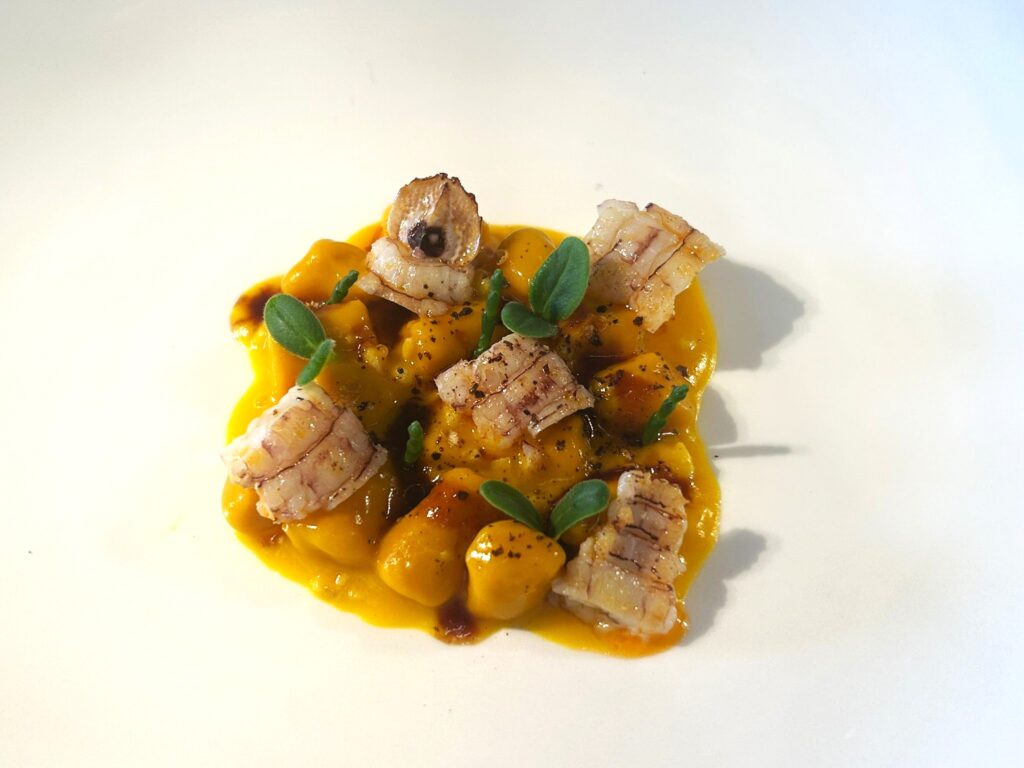 Gnocchetti di zucca con cicala di mare demi glace di cicala salicornia e borragine
