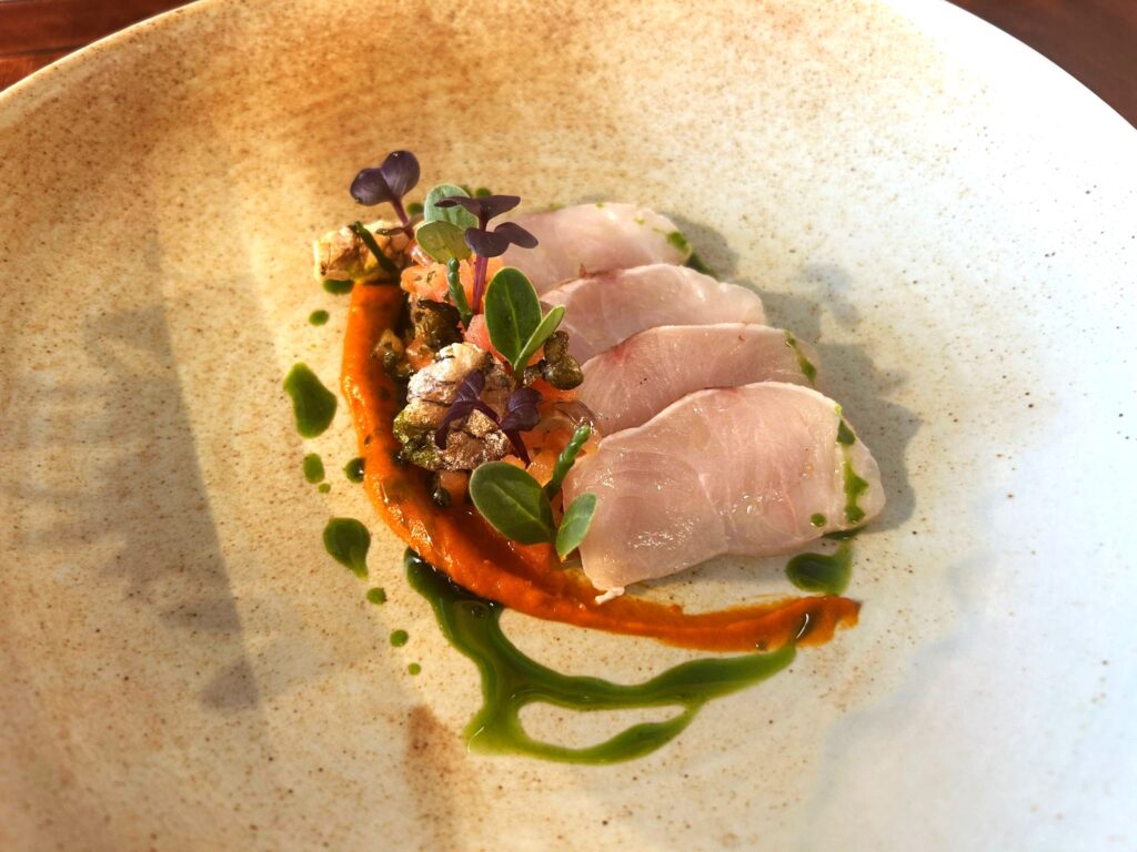 A partire dal benvenuto, costituito dal riciclo degli scarti della ricciola (con sedano e spuma di crostacei) che subito dopo viene servita con una meravigliosa salsa alla pizzaiola, capperi, mostarda e olio al prezzemolo; e in alternativa al calamaro accompagnato dal (forse troppo) robusto ragù di polpo con carciofi grigliati e limone salato. La vera eccellenza si raggiunge però al momento dei primi piatti. Che si tratti dei perfetti cavatelli di grano arso ai frutti di mare con crema di cicerchia, aglio, olio e peperoncino; o dei cremosi gnocchetti di zucca con cicala di mare, demi glace di cicala, salicornia e borragine. Mentre tra i secondi, convincono i sentori agrodolci dell’anatra glassata al miele con barbabietola, arancia, involtino di cosce d’anatra (un capolavoro!), e fondo di cottura aromatizzato con la melagrana. Si chiude con la deliziosa mousse di castagne e rum con biscotto al cioccolato e gelato alle fave tonka, e uno specifico encomio meritano la fragrante focaccia e l’ottimo pane fatti in casa. L’interessante selezione enologica si lascia apprezzare per l’assenza quasi totale di etichette convenzionali.