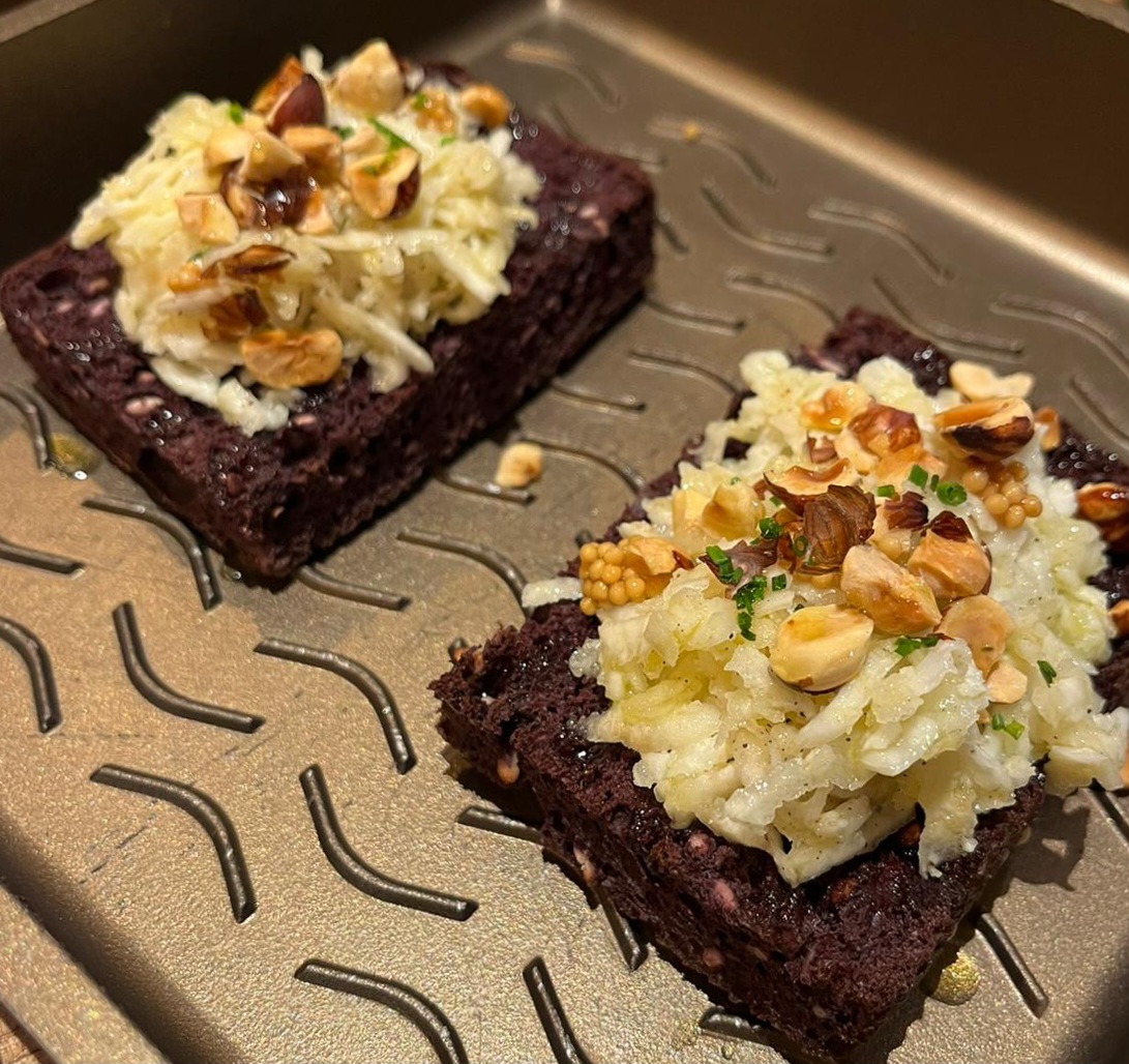 Si continua con il vortice di sentori ora acidi, ora amari, ora speziati che caratterizzano le due portate successive. Che si tratti della bruschetta di riso nero e riso soffiato con insalata di sedano rapa, nocciole tostate e senape in grani; oppure del carciofo glassato con panna acida al whisky, polvere di barbabietole e polvere di lievito morto.